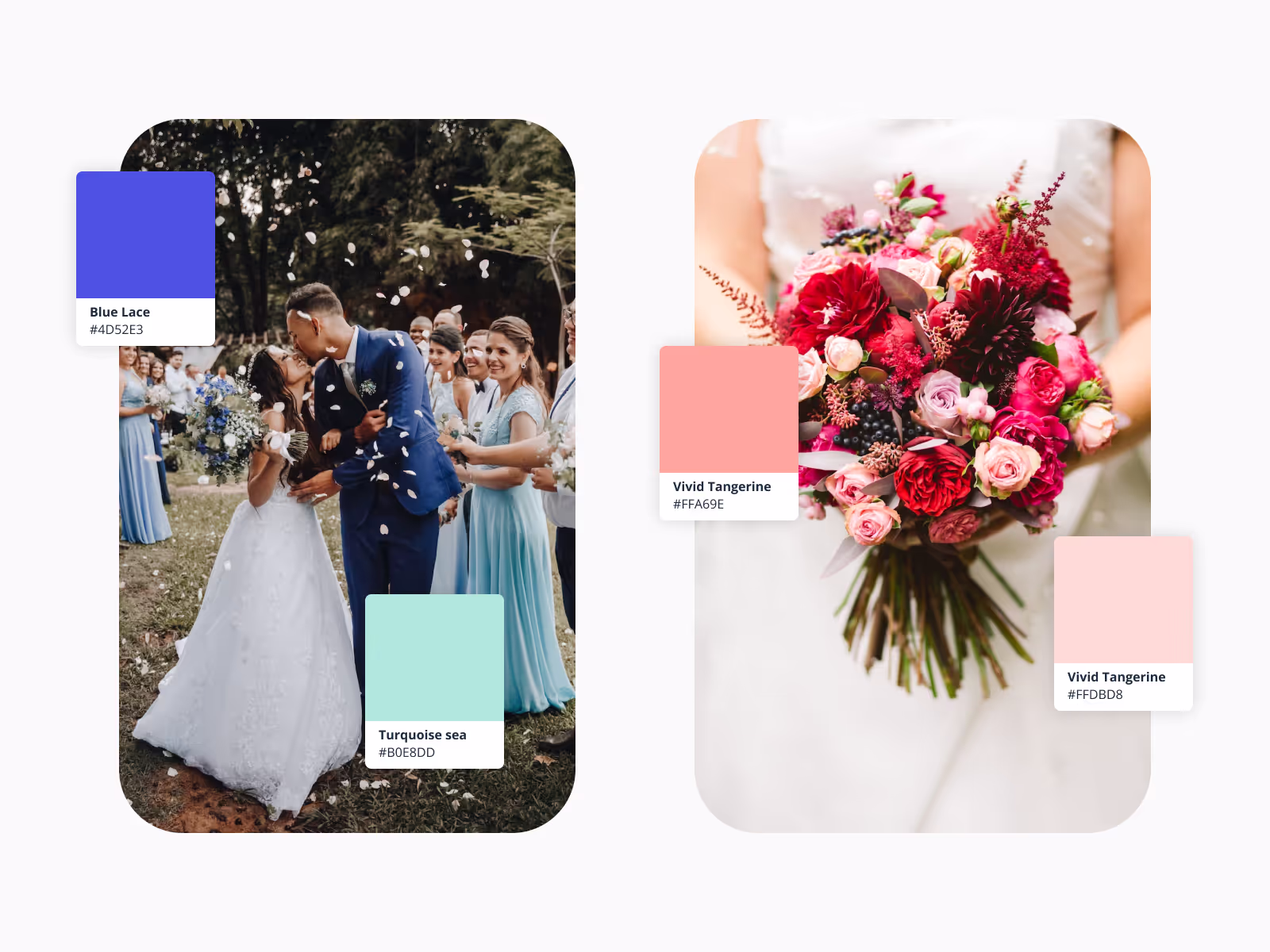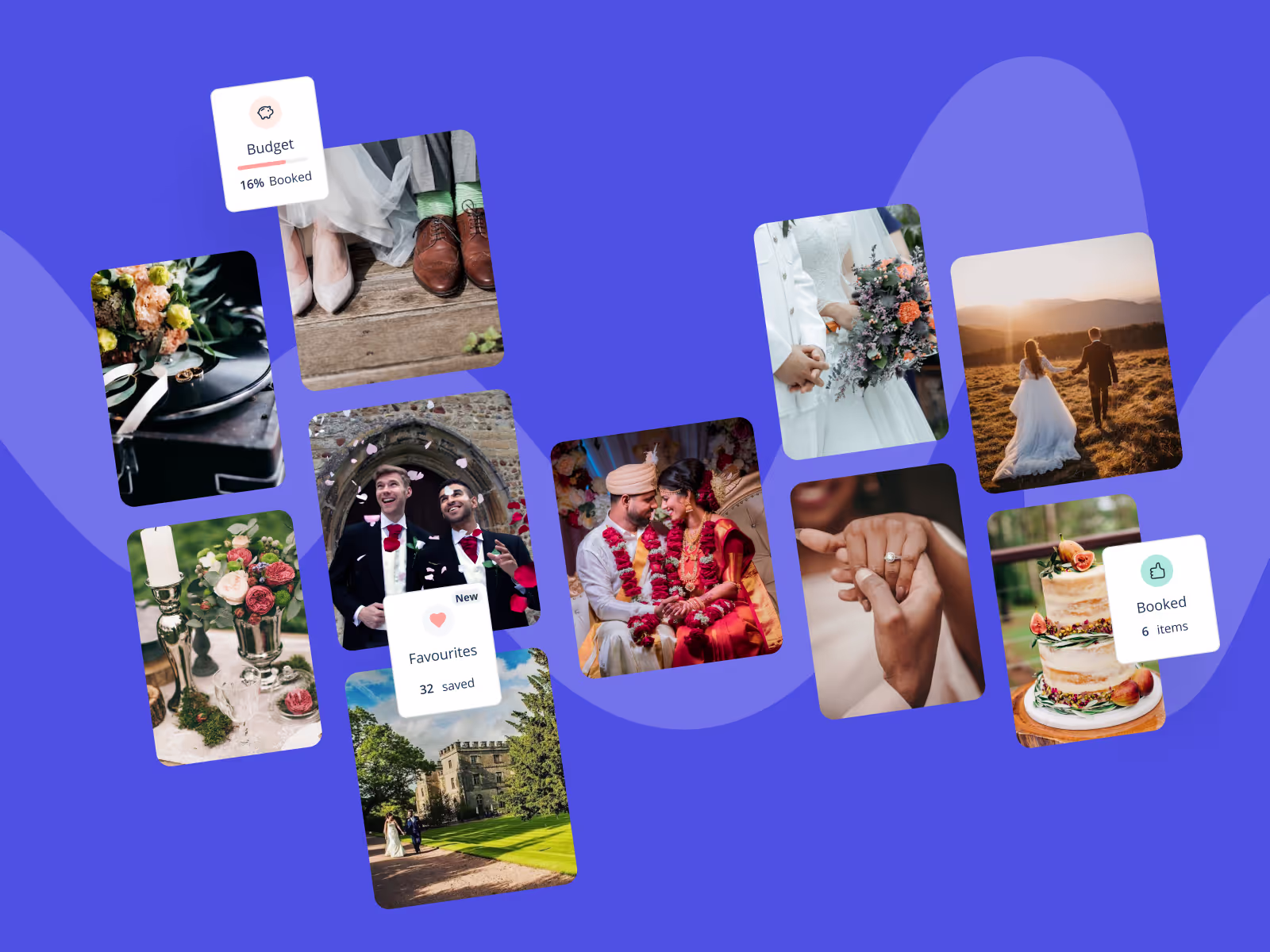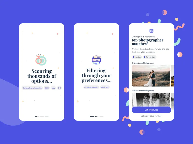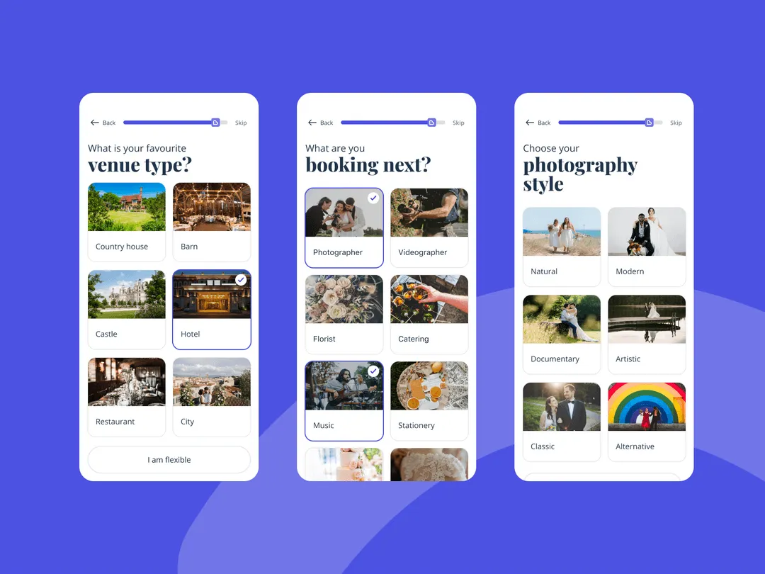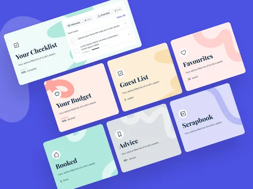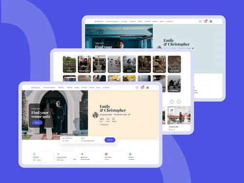 Next, we mapped out the flows in low-fidelity wireframes. Once all the structures and flows were in place, we moved to the design refresh. The Bridebook team wanted their users to be "wowed", so we updated their typography styles, UI library and colour pallet to keep their look current. We ensured the imagery and prompts reflected that the Bridebook brand includes all genders and all religions.