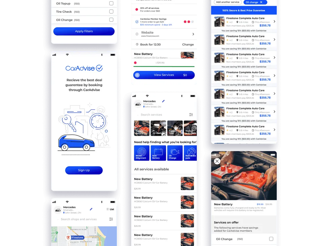 We worked with their existing brand and style guide to create a new UI system and component library. We also rethought the app UX to mimic the patterns of on-demand grocery and takeaway apps. The mission for CarAdvise was to make the garage booking system as smooth and straightforward as ordering a pizza, and we helped them achieve this with better search, filter, map, and booking functionality.