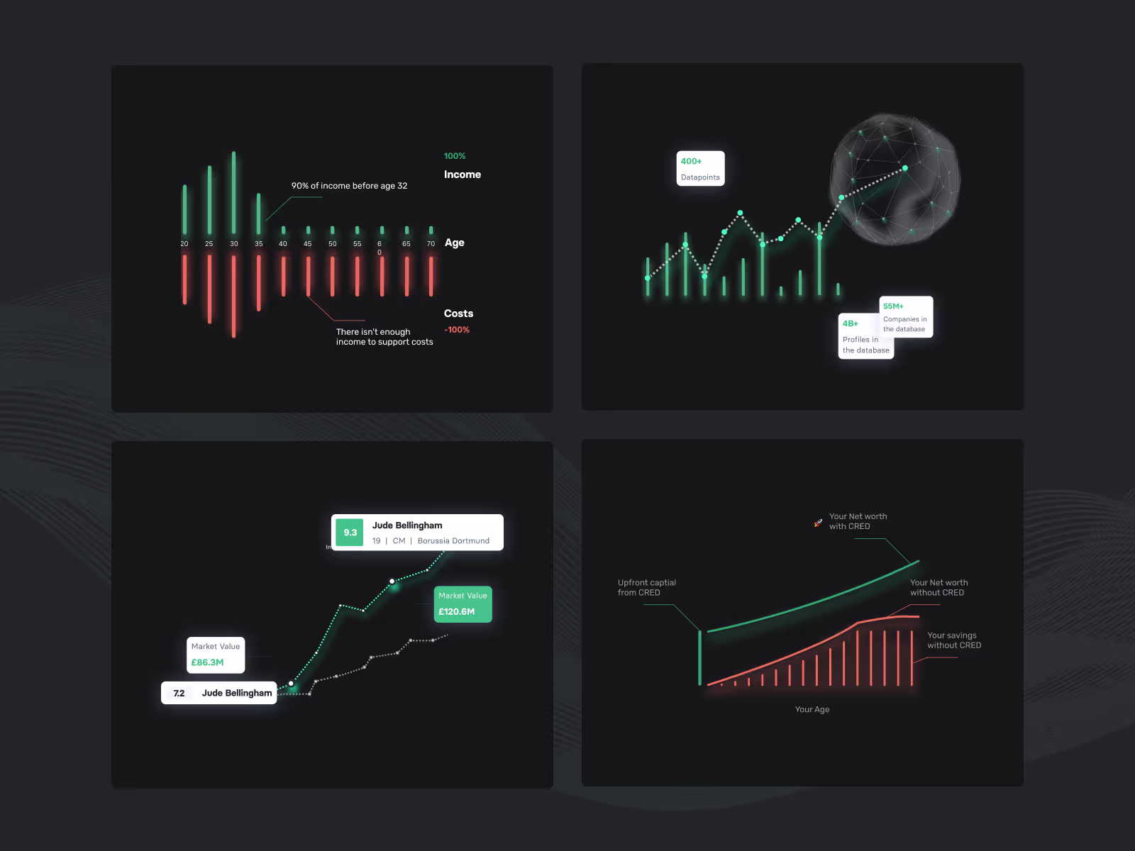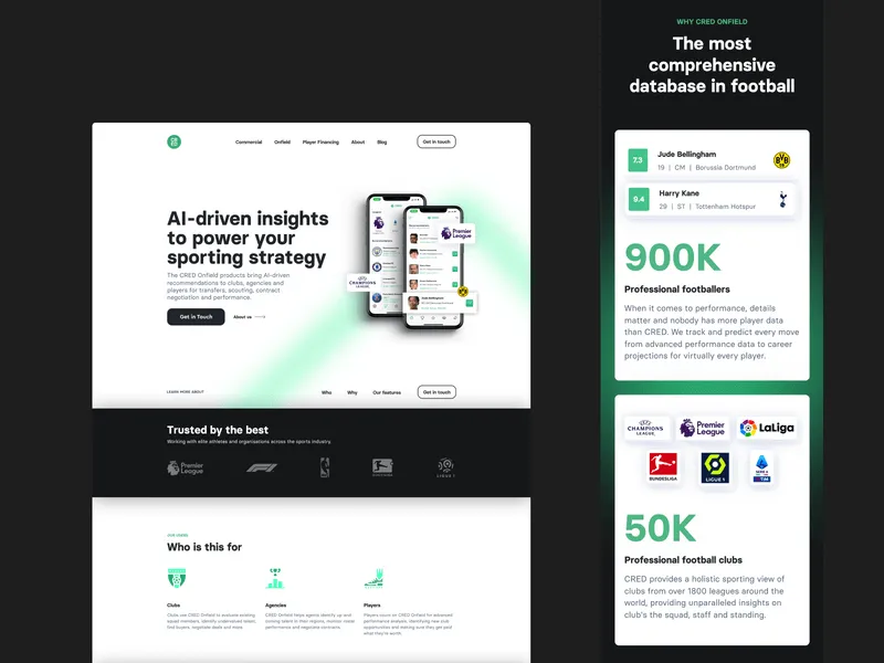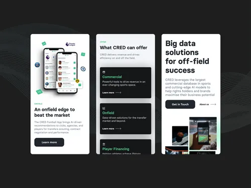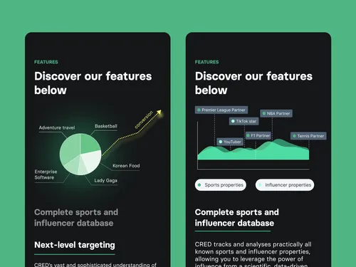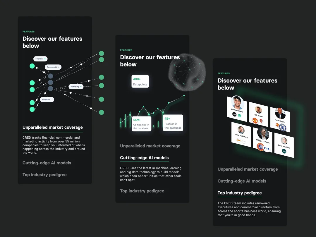 We used the CRED signature green and added an on-trend neon glow throughout decorative 3D graphics. We changed the landing page to dark mode and wanted the design to give a feel of the product's cutting-edge use of technology. A key feature of our redesign is engaging infographics displaying their service's data.