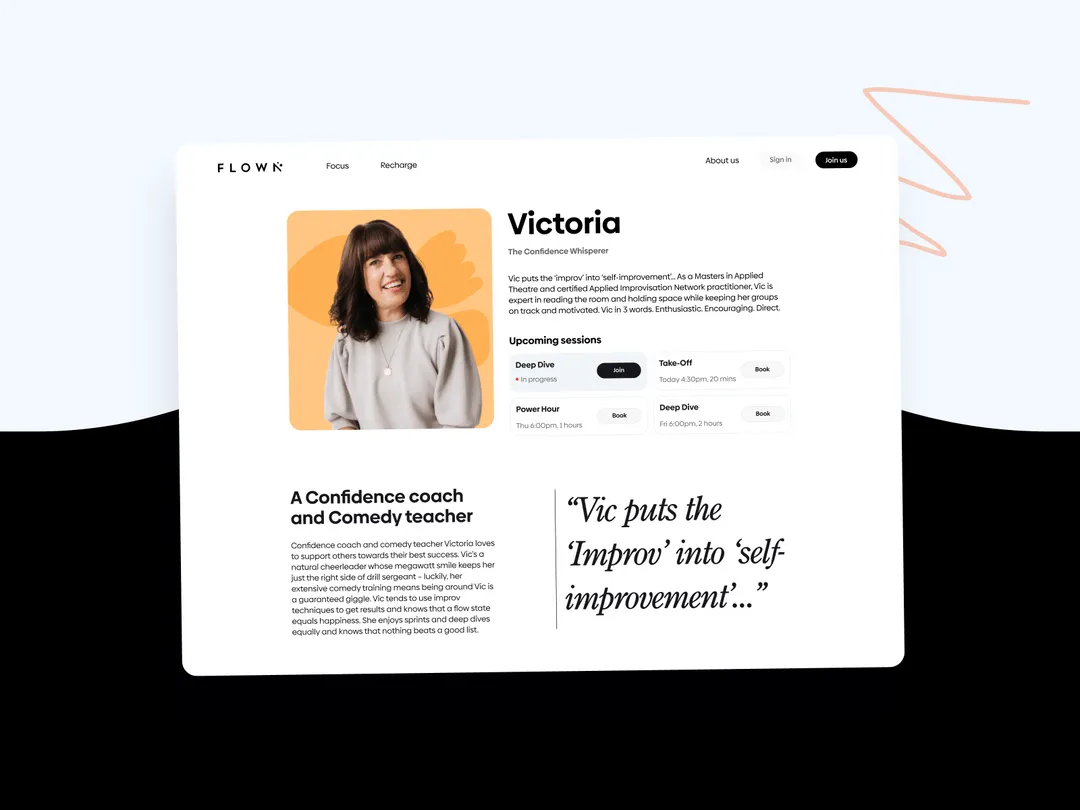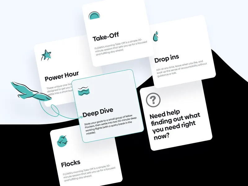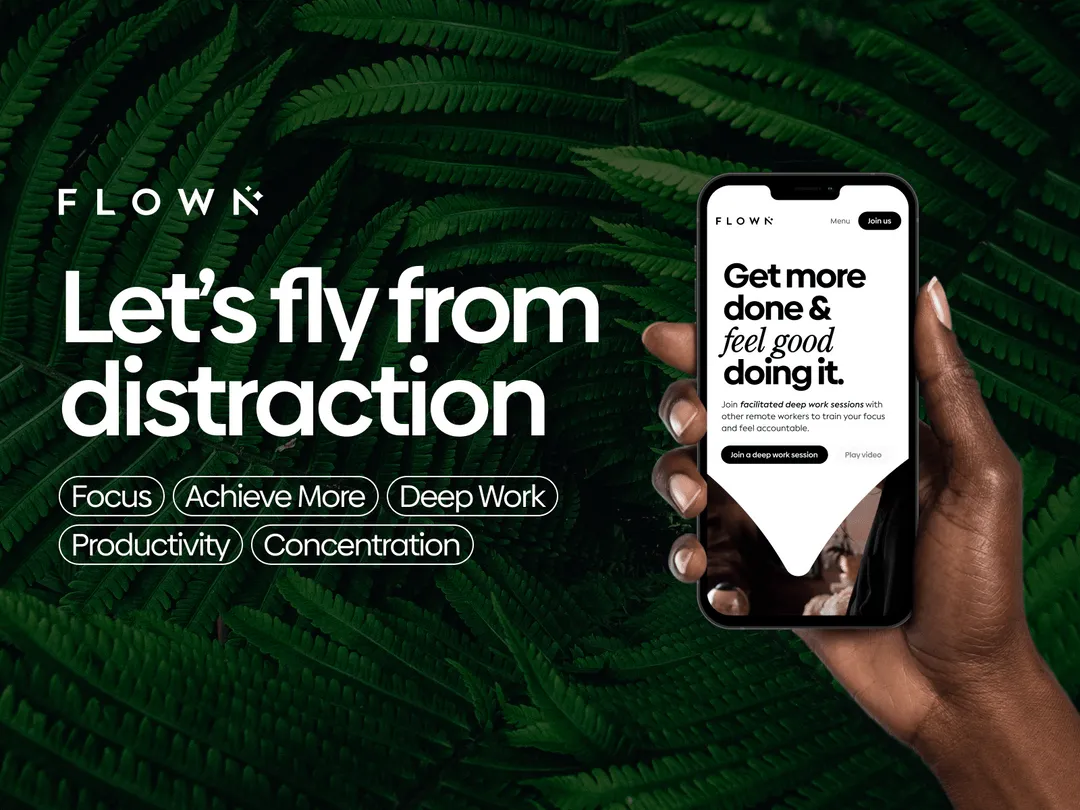 Flown saw this and created a product for deep work sessions with the vision to help people work better, leading to more job satisfaction and a better state of mind. They run online sessions to help free you from distraction and be more productive. Different prompts - structured sessions backed by neuroscience to help enrich the experience of working from home or alone.
