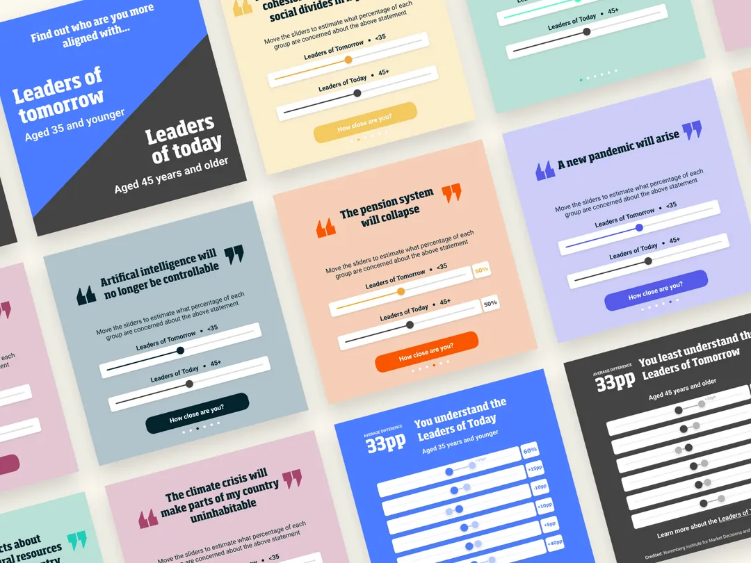 Initially, we were engaged to work with IMD's flagship "I x IMD Magazine", producing a mix of moving graphics for business articles. The complexity of the work has gradually increased, moving onto quizzes, competitions and interactive infographics, which can be utilised on social media through Gifs and Lotties. This work has continued monthly since our engagement alongside our development partners to sync with IMD's internal technical requirements.We have approached each brief set by IMD with a different strategy as we aim to deliver fresh and exciting work every time to keep their audience engaged. We broke free of IMD's traditional business / academic branding, allowing us to create a content-driven aesthetic more directly connected to the brief. They gave us the freedom to experiment with colour and typography.