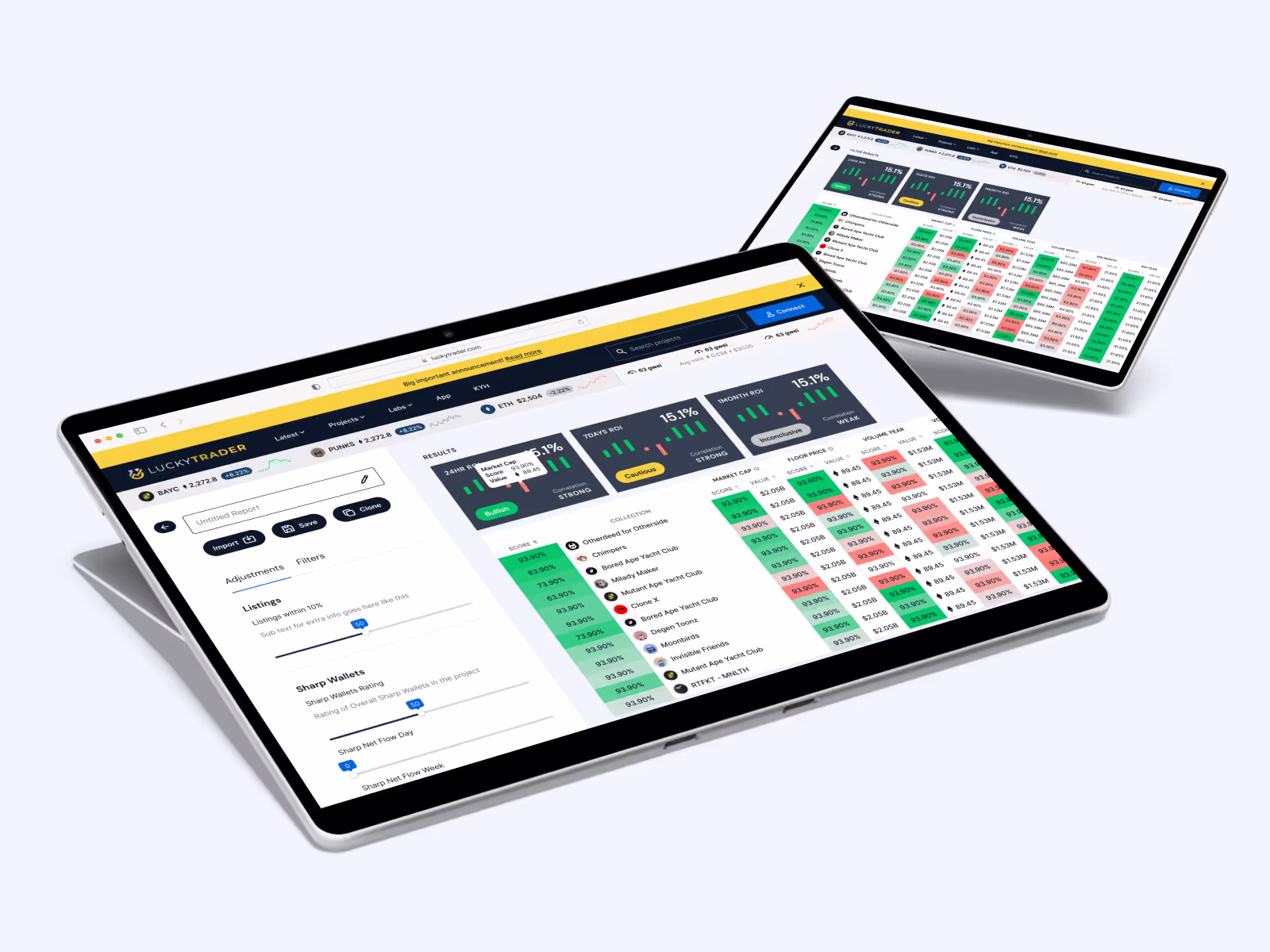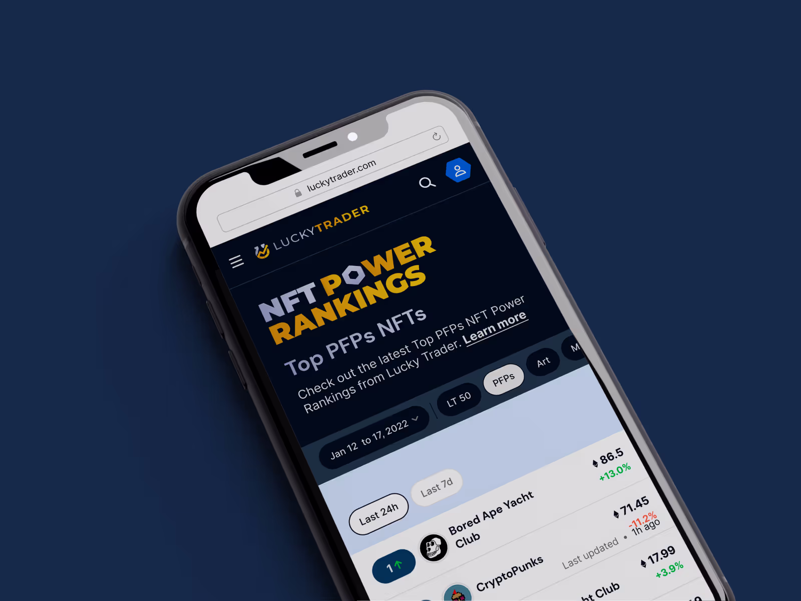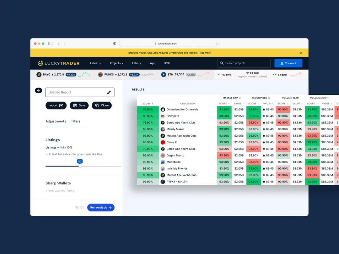 Luckytrader is an American research platform for traders of NFTs, marketing itself as "The trusted source for NFT news coverage," keeping its users informed of news, trends, and the current market. Intending to be the Bloomberg of the Web3 world, we helped visually develop Luckytrader to distil the millions of data points in the crypto market and make an accessible news and analysis website.