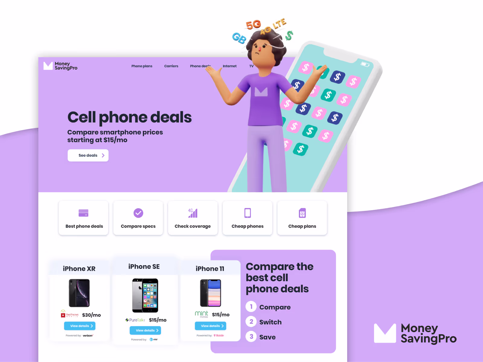 MoneySavingPro is a U.S. comparison site that provides customers with a side-by-side look at different providers' pricing and ultimately saves on cell phone, TV and internet plans. MoneySavingPro analyses the top competitors along with smaller providers such as T-Mobile, At&t, Verizon and MintMobile so that their users get the best deals on the market and, ultimately, save money. They were looking for a brand refresh and complete site redesign to boost their presence in the industry and bring more traffic to the site.