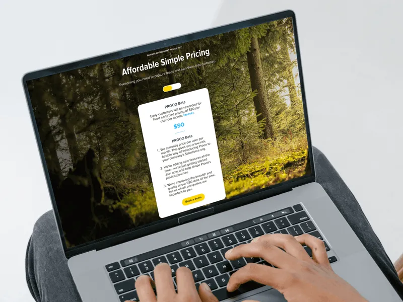 Proco is an ESG rating tool created for salespeople to disclose prospective clients' ESG ratings and help them close better deals. ESG stands for "Environmental, Social and Governmental ethics" and is a great way to ensure responsible enterprise for business ventures. Built as a Chrome extension and Salesforce widget, we worked hands-on with the Founder to create a clean & professional visual brand identity and marketing site to help their launch.