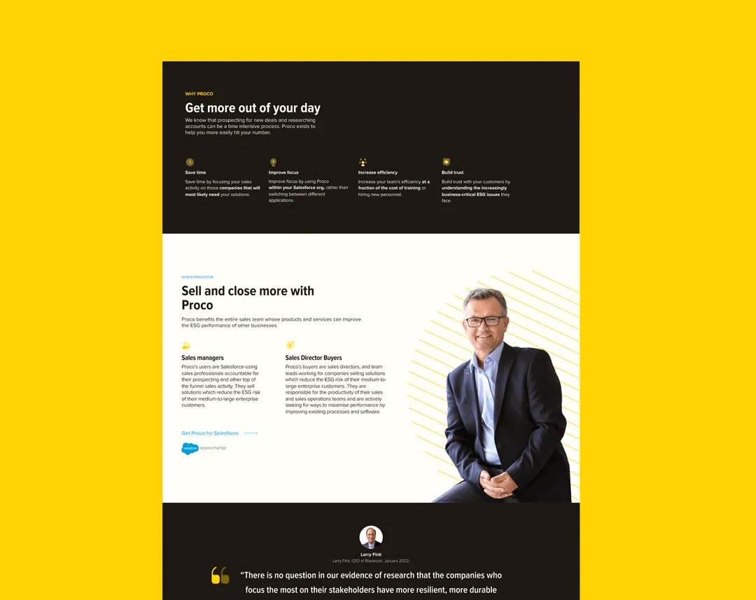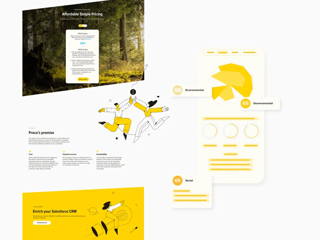 Compared to other salesforce widgets and traditional B2B sales tools, Proco stands out from the crowd. Inspired by the ethical heart of ESG, we created a bright brand not afraid of the future.