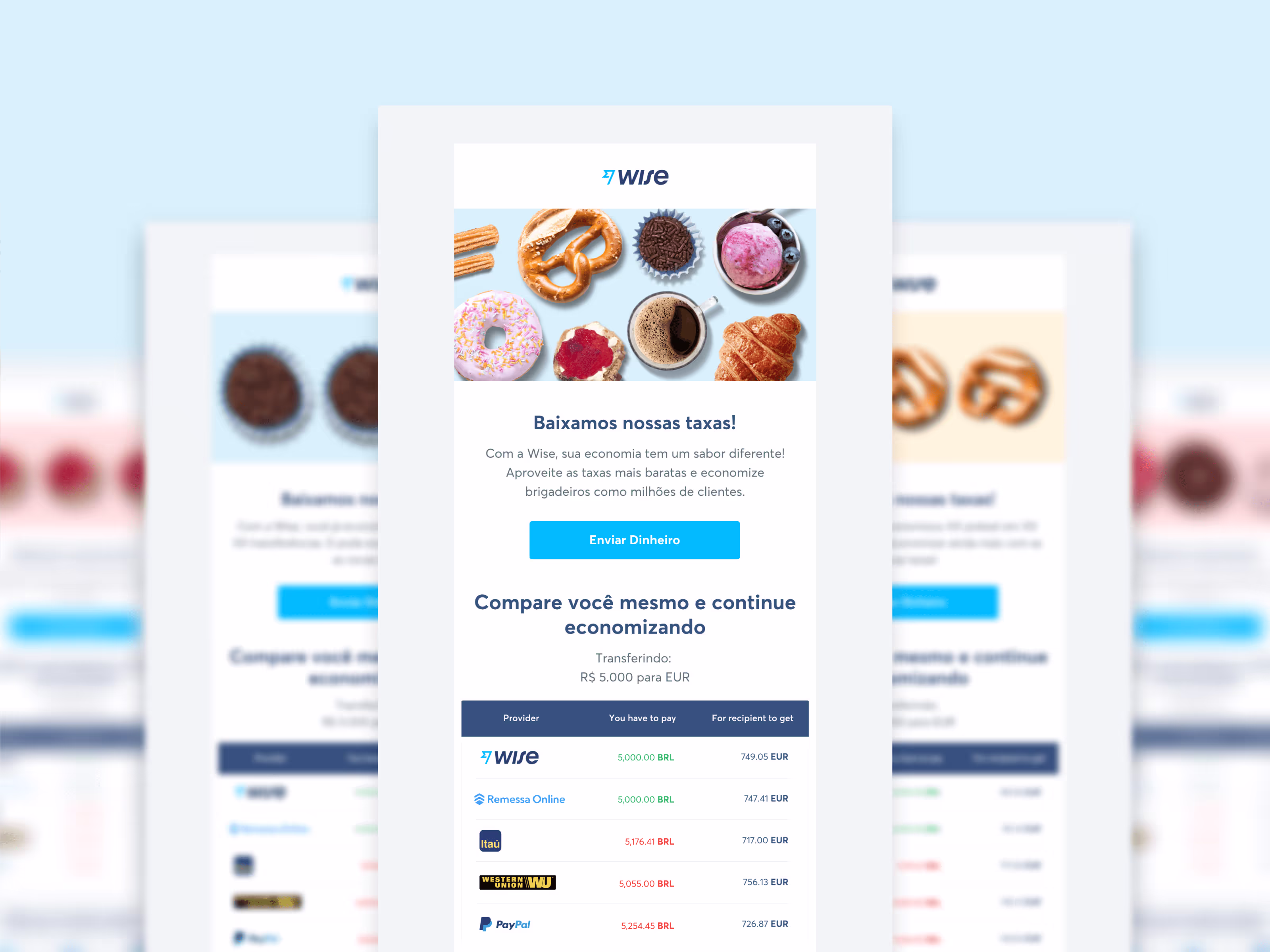 For the Brazilian marketing campaign, we looked to make Wise’s services more tangible and relatable to a local audience across targeted email, socials and paid ads. In doing so, we decided to utilise iconic food groups (in Brazil’s case, the famous “Brigadeiro”!) in order to quantify savings in an attractive and relatable visual format, making the potential customer look twice, thus driving traffic and engagement.